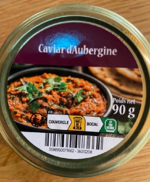 Ingrédients : aubergine 92,5%, huile d’olive 6,3%, ail 0,8%, sel 0,2%, poivre 0,2%, acidifiant : acide lactique 0,03%.